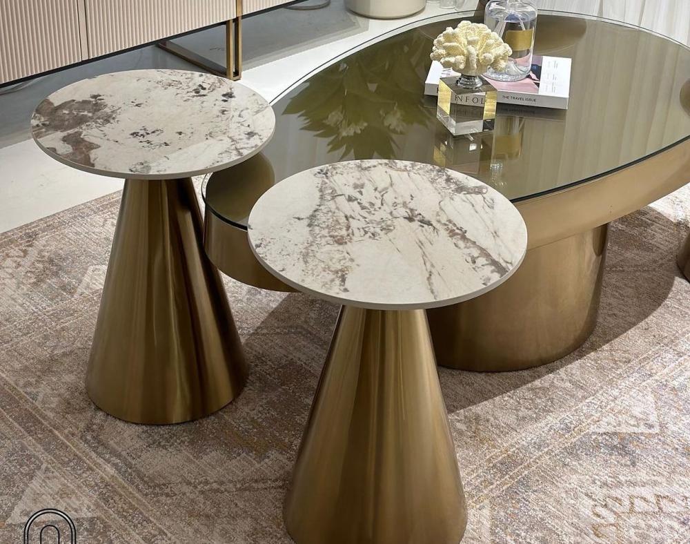 أضف لمسة من الأناقة والتميز إلى منزلك مع طاولة خدمة مفردة بتصميم عصري وفاخر. تتميز بسطح رخامي أنيق مع قاعدة معدنية ذهبية تضفي لمسة من الفخامة على أي مساحة. سواء كنت تبحث عن قطعة عملية أو ديكورية، فإن هذه الطاولة تقدم لك الخيار المثالي. لا تتردد في اقتنائها الآن لإثراء ديكور منزلك!
